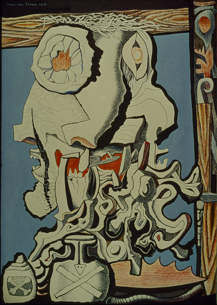 Tusche, Gouache, Farbstifte auf Papier auf Karton, 59 x 41 cm